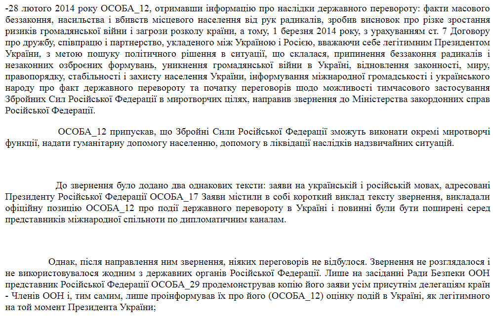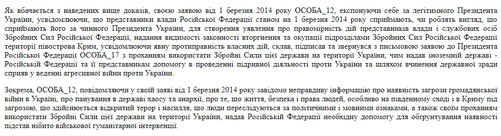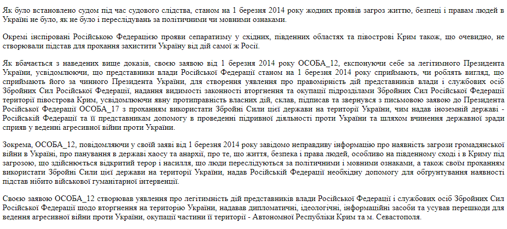 Сам Янукович, по мнению судей, в своем заявлении от 1 марта 2014 года сообщил заведомо ложную информацию о наличии угрозы гражданской войны в Украине, о господстве в стране хаоса и анархии, о том, что жизнь, безопасность и права людей, особенно на юго-востоке и в Крыму, под угрозой, что осуществляется открытый террор и насилие, и что люди преследуются по политическим и языковым признакам: