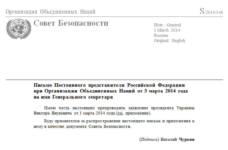 "Страна" обнаружила, что данный документ был размещен на сайте ООН под номером S/2014/146. В нем содержится обращение постоянного представителя РФ при ООН Виталия Чуркина, где он просил распространить заявление Виктора Януковича в качестве документа Совета Безопасности ООН: