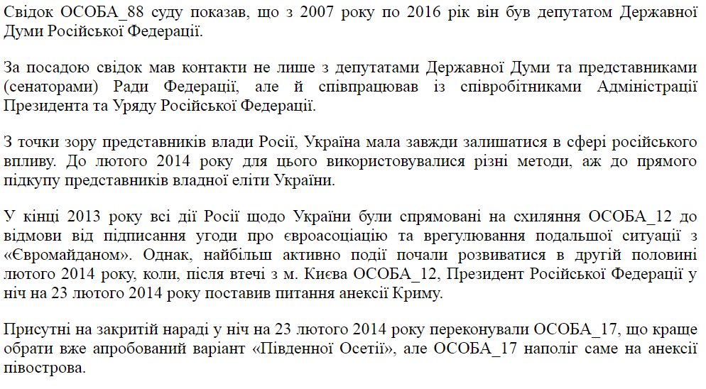 Одним из ключевых свидетелей обвинения стал бывший депутат Государственной думы РФ Илья Пономарев. Депутат сообщил суду, что президент РФ на закрытом совещании в ночь на 23 февраля 2014 года поставил вопрос аннексии Крыма. Откуда ему стали известны подробности закрытого совещания с участием Путина, Илья Пономарев не уточнил: