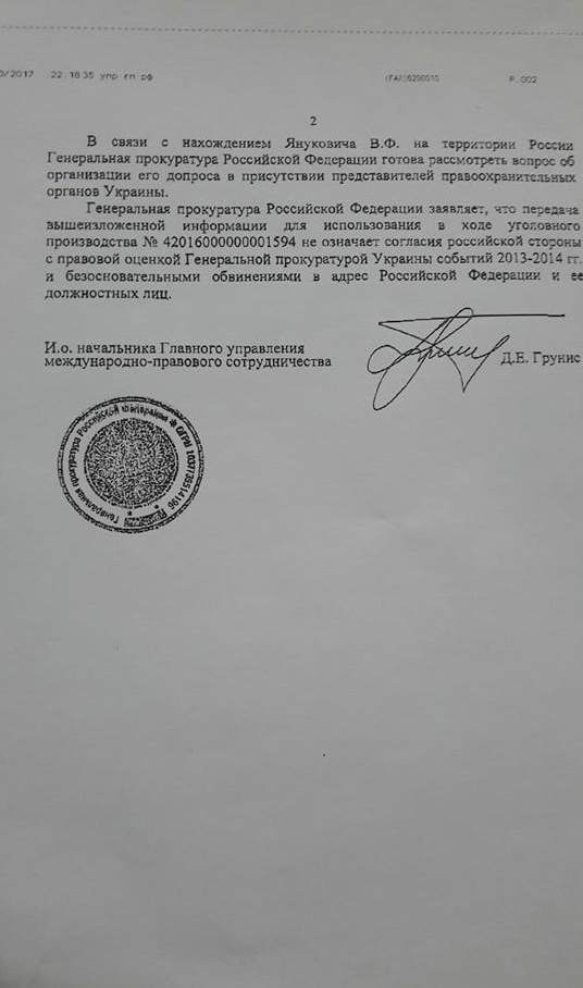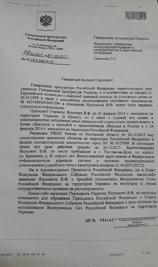 Кроме того, в дальнейшем российские власти стали отрицать сам факт получения от Януковича заявления с просьбой ввести войска. Все тот же генпрокурор Юрий Луценко в марте 2017 года опубликовал в своем Facebook письмо Генпрокуратуры РФ. В нем говорилось, что ни в администрацию Президента РФ, ни в Совет Федерации не поступало какое-либо заявление В.Ф. Януковича с просьбой использовать Вооруженные силы РФ на территории Украины: