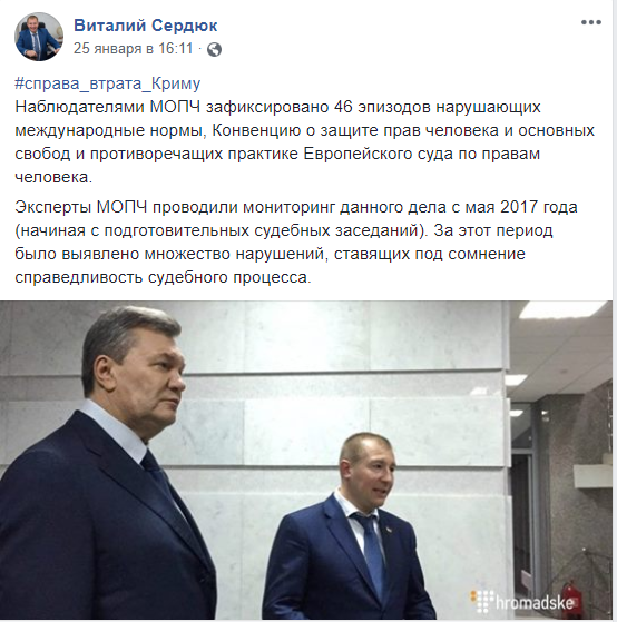 Адвокат Виктора Януковича Виталий Сердюк сообщил в Facebook, что наблюдатели Международного общества прав человека (МОПЧ) зафиксировали в ходе процесса над Януковичем 46 эпизодов, нарушающих международные нормы, Конвенцию о защите прав человека и основных свобод и противоречащих практике Европейского суда по правам человека. Все они ставят под сомнение справедливость судебного процесса.