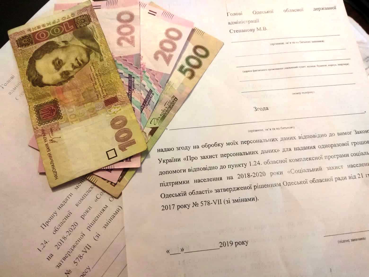 В конкретно данном случае заявление можно оформить на имя губернатора Одесской области Максима Степанова. Бланки, по словам общественного деятеля из Одессы Андрея Юсова, вручали людям сотрудники социальных служб, советуя указывать сумму не более 1000 гривен. Деньги обещали выслать почтовым переводом.