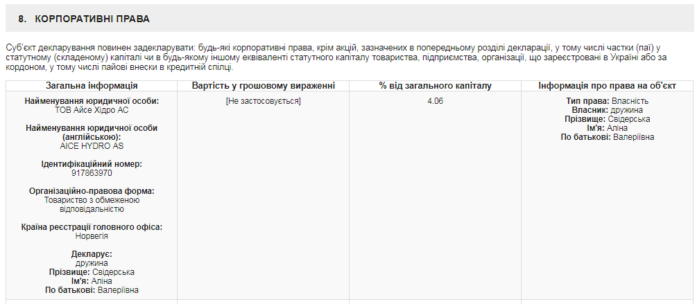 Сейчас супруга министра обороны руководит ООО "Айсе хидро юкрейн". Фирма занимается работает в области электроэнергетики. Владеет этой фирмой норвежская компания AICE Hydro AS. В ней основные владельцы - граждане Норвегии и Дании. Алине Свидерской принадлежит в норвежской фирме 4,06% капитала. Об этом сам новый министр сообщил в своей декларации:
