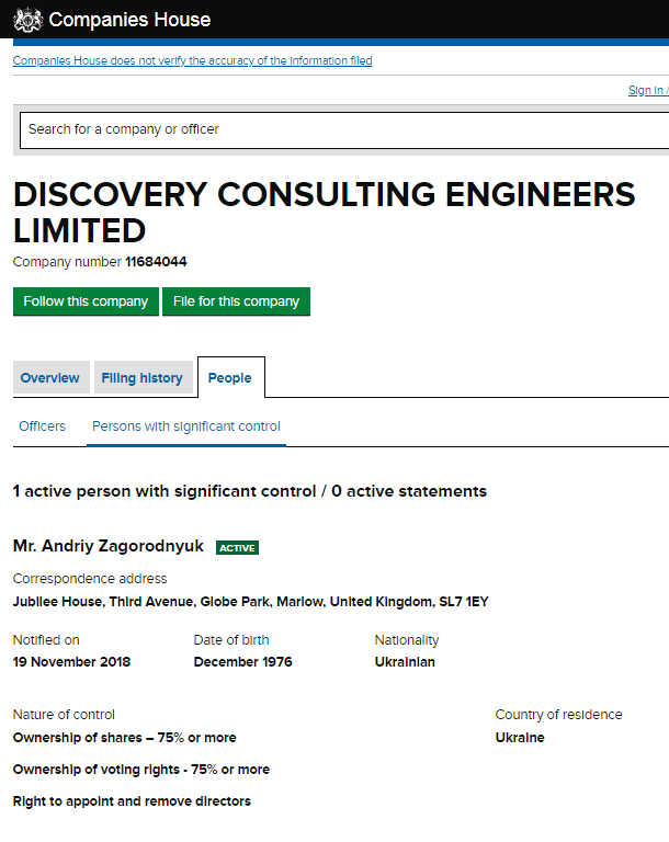Кроме того, согласно поданной декларации, Андрей Загороднюк является 100-процентным владельцем британской компании Discovery Consulting Engineers Limited: