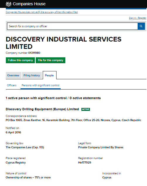 Эту фирму-"прокладку", можно легко вычислить через британский реестр компаний. В нем указано, что владелец британской фирмы - кипрская компания "Discovery Drilling Equipment (Europe) Limited", и на нее записаны больше 75 % акций британской фирмы: