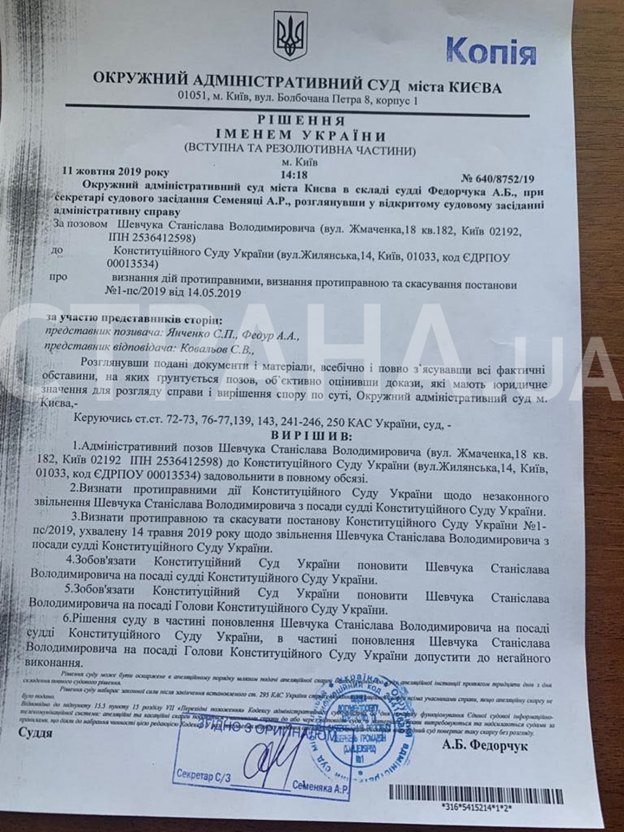 А в пятницу 11 октября окружной админсуд Киева принял решение о восстановлении в должности главы КСУ Станислава Шевчука.  "Страна" подробно разбиралась, что это означает для судебной системы. Важный нюанс: принимая решение о восстановлении Шевчука в должности, суд постановил выполнить это решение немедленно: