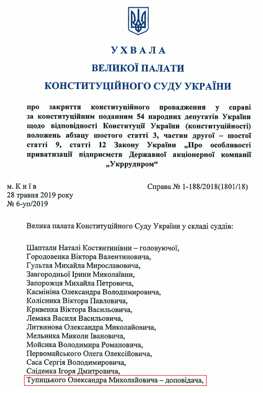 Но, как рассказывала "Страна", после того, как с поста главы КСУ был уволен Станислав Шевчук, дело по "Укррудпрому" забрал себе Александр Тупицкий. После этого 28 мая 2019 года был оперативно вынесен вердикт о закрытии рассмотрения дела. Судьей-докладчиком по данному делу был Александр Тупицкий, это указано в тексте решения КСУ по делу: