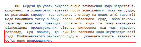 Поэтому ЕСПЧ пришел к выводу, что сомнения заявителя (т.е. Сергея Салова) о беспристрастности судьи Куйбышевского районного суда г.Донецка "могут считаться объективно оправданными":