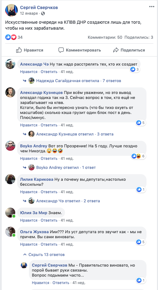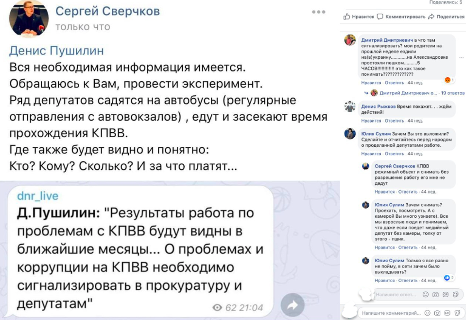 Однако один из молодых депутатов "Народного Совета ДНР" от партии "Свободный Донбасс", зампредседателя комитета по транспорту и связи Сергей Сверчков – не хотел сдаваться, и продолжал педалировать данную проблему: ездил на блокпосты и "кошмарил" служащих "МГБ" и "МВД" (последних он регулярно обвинял в усложнении процесса прохода границы – вследствие дублирования сбора информации), регулярно поднимал эту тему в соцсетях и СМИ, писал обращения на имя "главы республики", инициировал проверки на КПВВ. "Искусственные очереди на КПВВ ДНР создаются лишь для того, чтобы на них зарабатывали" - написал он в своем профиле в Фейсбук 12 января 2019 года.