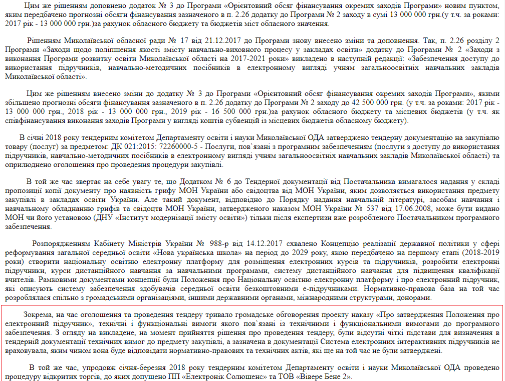 Суть дела такова. В конце 2016 года в Николаевской области была утверждена Программа развития образования на 2017-2021 годы. В ней, среди прочего, было предусмотрено обеспечение доступа учеников  к электронным версиям учебников. Под эту программу было предусмотрено финансирование на десятки миллионов гривен.