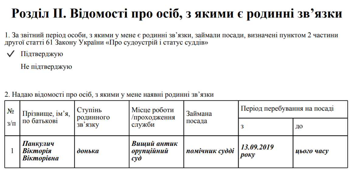 В прошлом году одна из трех дочерей судьи Панкулича тоже начала работать в Высшем антикоррупционном суде на должности помощником судьи. Об этом сам судья сообщил в документе, который называется "Декларация семейных связей":