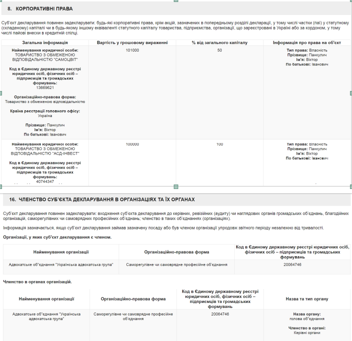 Проблема в том, что судья Панкулич не отразил наличие у него этой фирмы в декларациях ни за 2018, ни за 2019 год. Хотя другие фирмы, где он был учредителем и директором, судья показал – это адвокатское объединение "Украинская адвокатская группа", а также два ООО – "Самоцвет" и "АСД-Инвест":