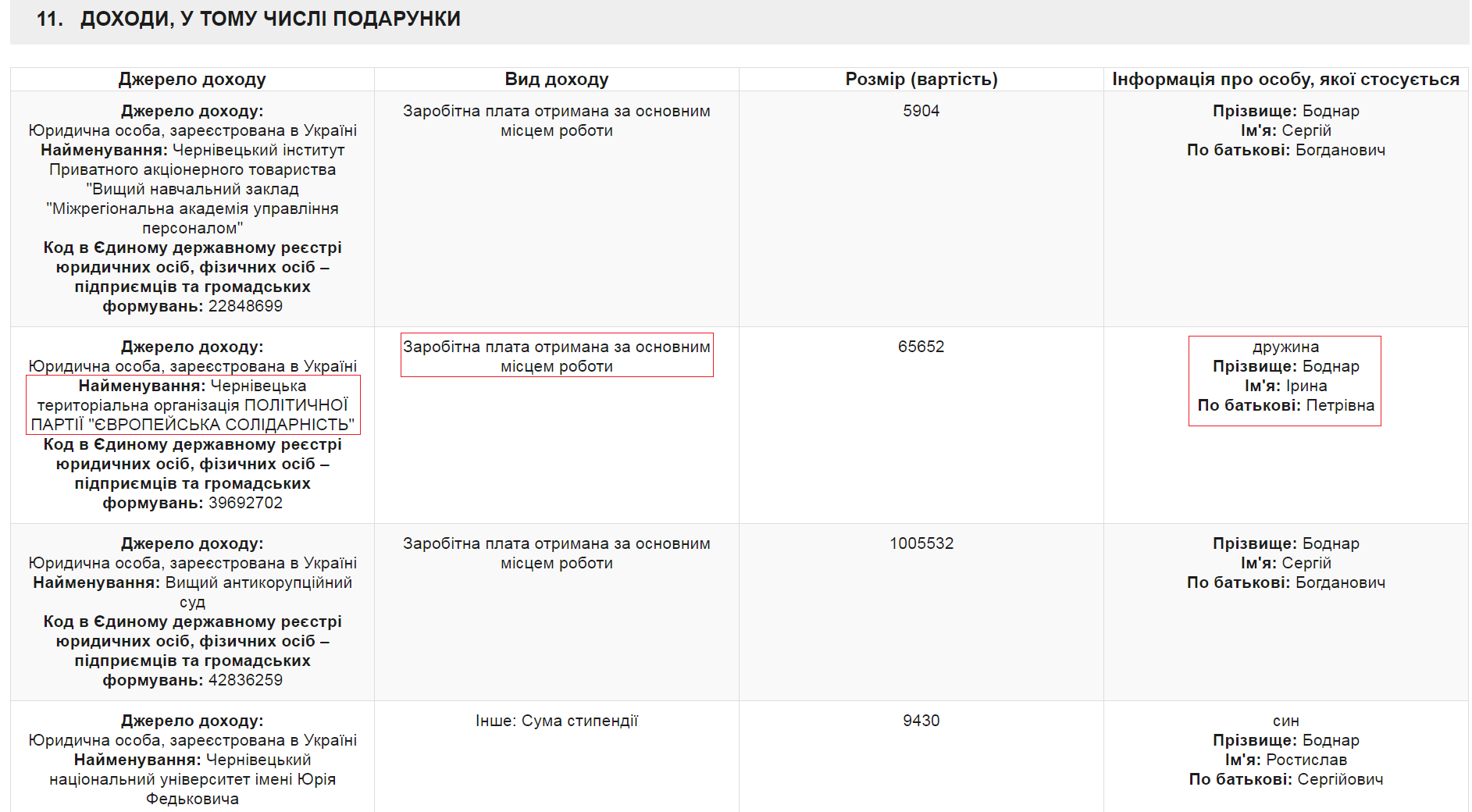 В декларации за 2019 год судья Боднар подтвердил данную информацию, сообщив, что его жена за год получила больше 65 тысяч грн зарплаты по основному месту работы в Черновицкой территориальной организации партии Петра Порошенко "Европейская солидарность":