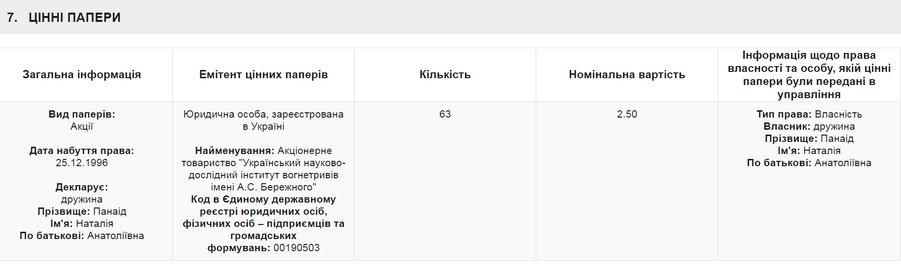 В декларации судьи Панаида тоже есть недочеты, правда не такие катастрофические, как у коллеги из Черновцов Боднара. Например, в декларации за 2018 год Игорь Панаид показал наличие у супруги акций акционерного общества "УкрНИИ огнеупоров". Акции были приобретены в 1996 году: