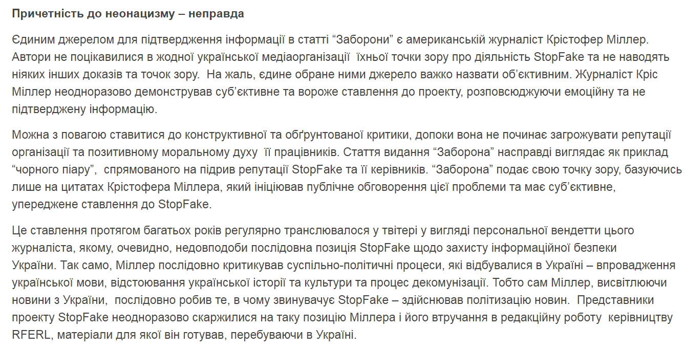 Еще одна претензия StopFake к "Забороне" касалась источника информации о причастности к неонацизму. StopFake утверждал, что единственным таким источником стал американский журналист Кристофер Миллер.