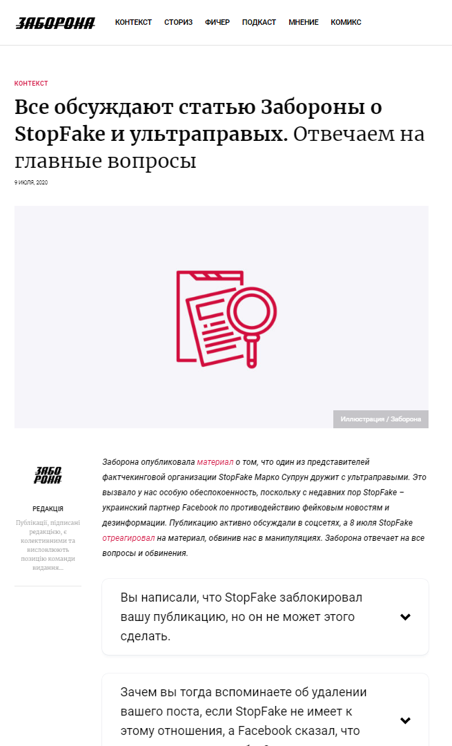 Сначала StopFake заявил, что блокировка ним статьи "Забороны" – это неправда: "Поводом для публикации стала якобы блокировка фактчекерами статьи на странице этого ресурса. Об этом авторы заявляют в первом абзаце текста. Но StopFake никогда не блокировал никаких материалов сайта "Забороны" в сети "Фейсбук":