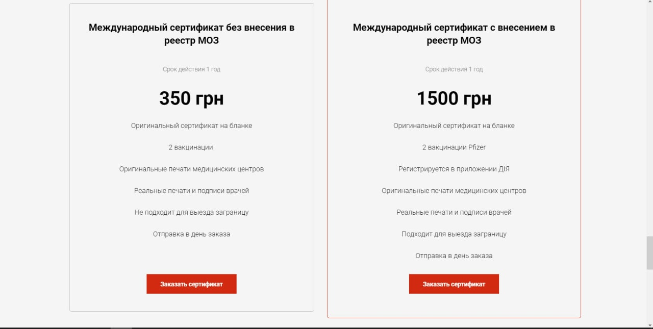 Стоимость поддельного международного сертификата с внесением в реестр МОЗ – 1500 грн, а без внесения в реестр Минздрава – 350 грн (такой документ не регистрируется в "Дие" и не подходит для выезда за границу). То есть купить сертификат на этом сайте дешевле, чем сдавать реальный ПЦР-тест.