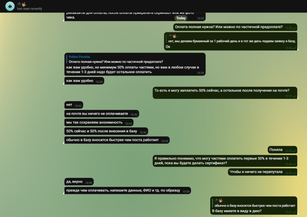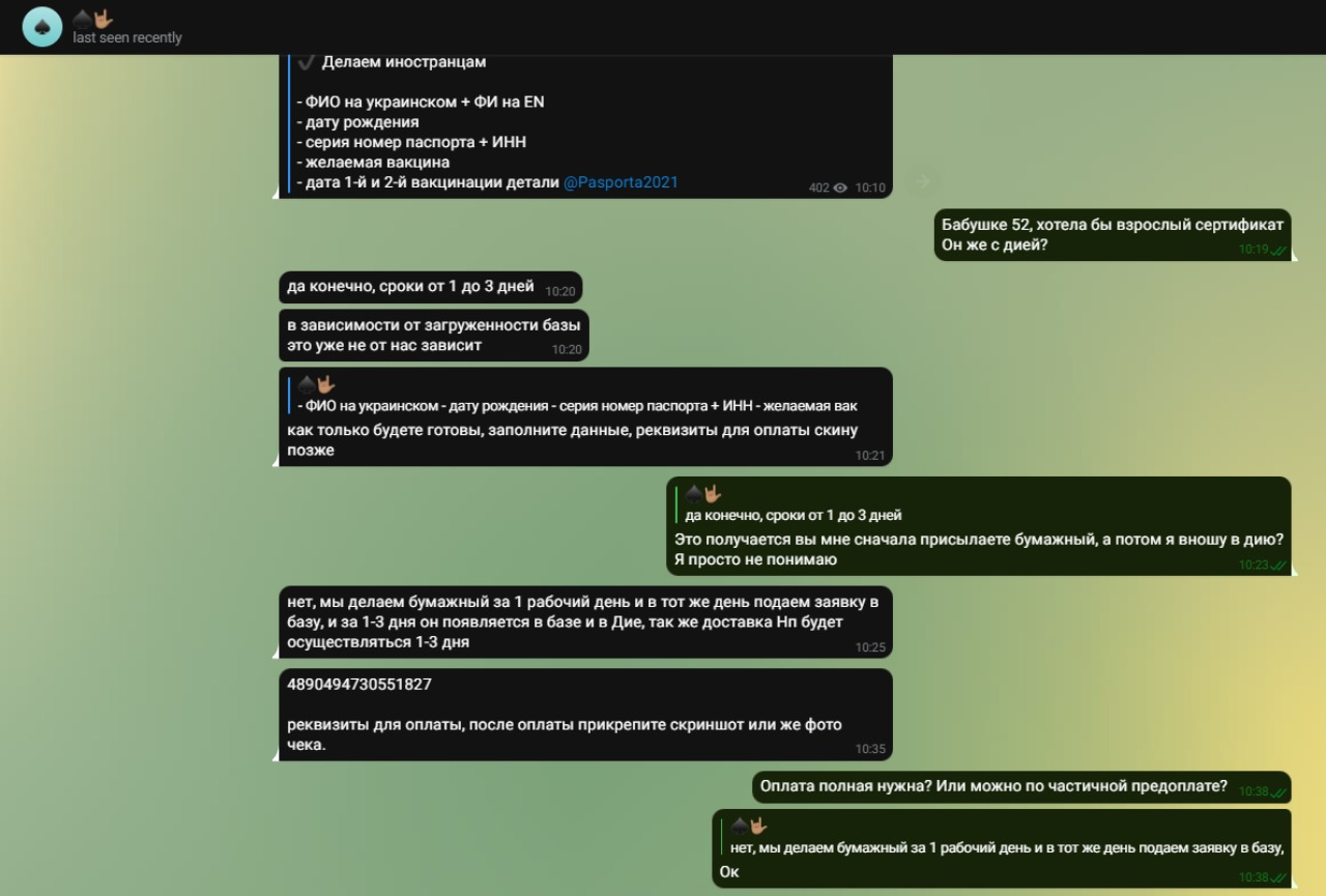 На этапе оплаты "Страна" не рискнула переводить деньги менеджеру этого Telegram-канала, памятуя описанный выше опыт с сайтом, а также прислушавшись к совету специалиста, знакомым с подпольным рынком вакцинации.