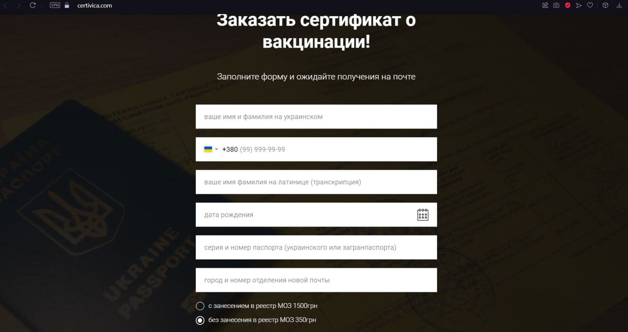 Для приобретения документа достаточно заполнить форму на сайте: ввести свое имя и фамилию на украинском языке и на латинице, номер телефона, дату рождения, серию и номер паспорта (на выбор предлагается украинский или загранпаспорт), а также указать город и отделение "Новой почты". После чего на сайте высвечивается уведомление о том, что заказ был принят и в скором времени с вами свяжется менеджер.