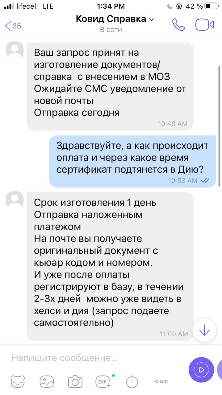"Страна" связалась с менеджером этого канала, чтобы узнать детали сделки. В первую очередь у нас спросили, кто именно посоветовал обратиться к посреднику. После чего уточнили нужный город и вид сертификата – наш выбор пал на международный. Менеджер уверяет, что документ будет отображаться и в "Дие", и в системе "Helsi.me".