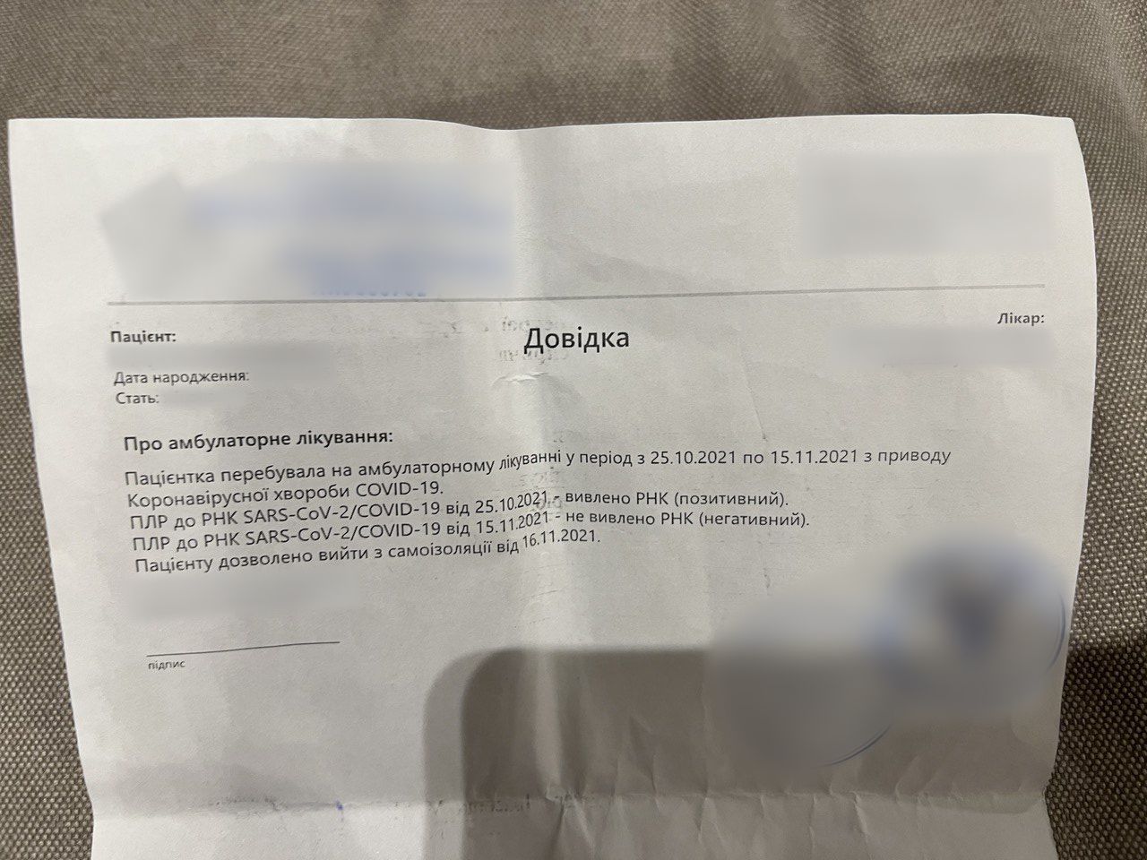 Доктор лишь поверхностно просмотрел информацию, указанную в ПЦР-тестах, и дополнительно спросил о том, когда появились первые симптомы заболевания. После чего сразу выписал справки о выздоровлении с тремя мокрыми печатями, подписью врача и датами ПЦР-тестов.