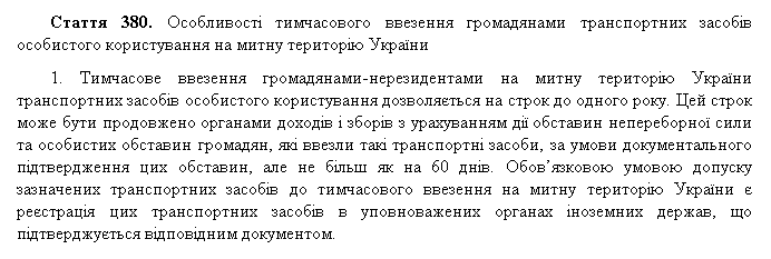 Основание для этой схемы - часть 1 статьи 380 Таможенного кодекса. По ней иностранец может ввезти авто с иностранной регистрацией в Украину без уплаты таможенных платежей сроком на год, с возможностью продлить срок еще на 60 дней из-за документально подтвержденного форс-мажора: