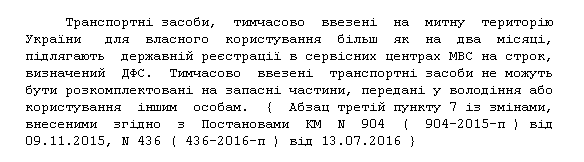 Еще нюанс - если авто ввезено на срок больше двух месяцев, то его нужно зарегистрировать в сервисном центре МВД и получить временные номера. Это предусмотрено пунктом 7 Порядка госрегистрации автомобилей, который утвержден постановлением Кабмина № 1388: