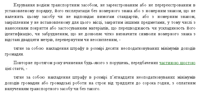 Однако этого, как правило, никто не делает. Ведь штраф за такое нарушение небольшой - всего 170 гривен. За повторное в течение года нарушение грозит либо штраф 255 гривен, либо общественные работы сроком 30 - 40 часов, с возможным платным изъятием автомобиля.