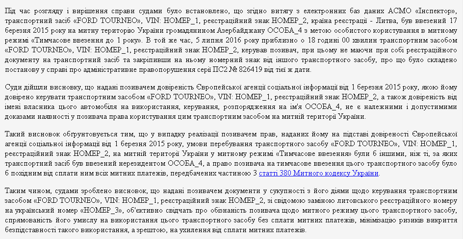 Согласно определению Высшего админсуда от 17 мая 2017 года по делу № К/800/16514/17, 17 марта 2015 гражданин Азербайджана ввез на территорию Украины автомобиль "Ford Tourneo" с литовской регистрацией в режиме временного ввоза до одного года.