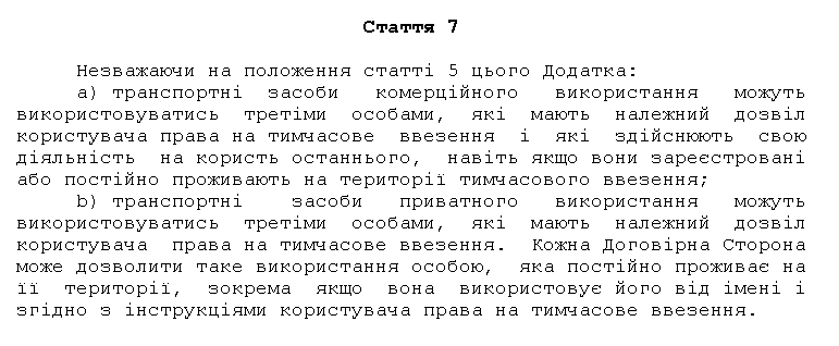 А что касается транспортных средств некоммерческого (частного) использования временно ввезенных авто, то они могут использоваться третьими лицами, имеющими надлежащее разрешение пользователя права временного ввоза. Однако при этом есть условие: договорная сторона Стамбульской конвенции (в нашем случае - Украина как государство) может позволить (а может и не позволить) такое использование лицом, постоянно проживающим на ее территории: