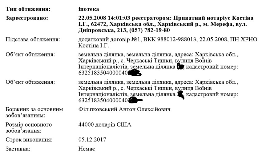 В июле 2012 года Коминтерновский райсуд Харькова в заочном порядке постановил взыскать с нерадивых заемщиков с учетом просрочек, штрафов и пени уже $88,6 тыс. и 335 тыс. грн. До возврата займа на трехкомнатную квартиру в Харькове, дом и участок земли в селе Черкасские Тишки, оформленные на Антона, наложен запрет на отчуждение или смену собственника. Четыре года назад эта собственность была арестована, и ее могут взыскать в счет долга.