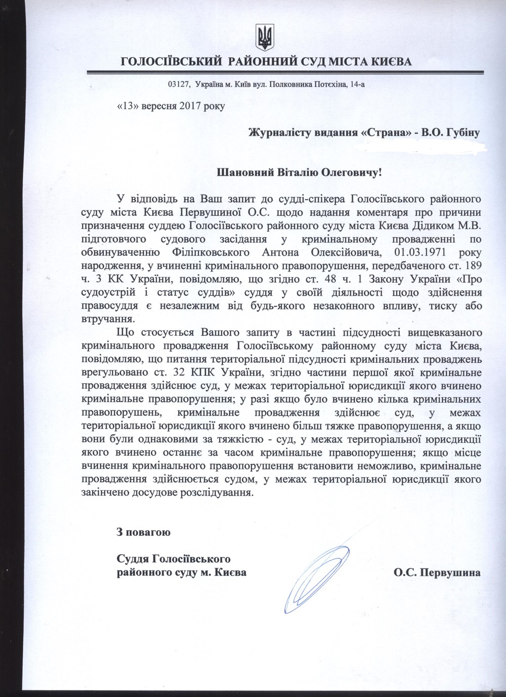 В неофициальных беседах служители Фемиды кивают в сторону прокуратуры, которая выступила инициатором "переброса" уголовного производства. Между тем, в ответе на запрос "Страны" о причинах направления "дела Филипковского" в суде сослались на ч.1 ст.32 УПК Украины.