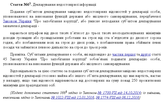 Чем это может грозить нардепу? Согласно статье 366-1 Уголовного кодекса Украины, за представление заведомо недостоверных сведений в декларации чиновника предусмотрена уголовная ответственность: