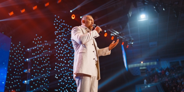 Наконец появляется виновник торжества – Владимир Мунтян. Одет во все белое, как невеста. С идеальной формы "меладзовской" бородой. По всему видно – он на сцене хозяин. Зал встречает его, как кинозвезду, только вместо криков "браво" – многократное "аминь".