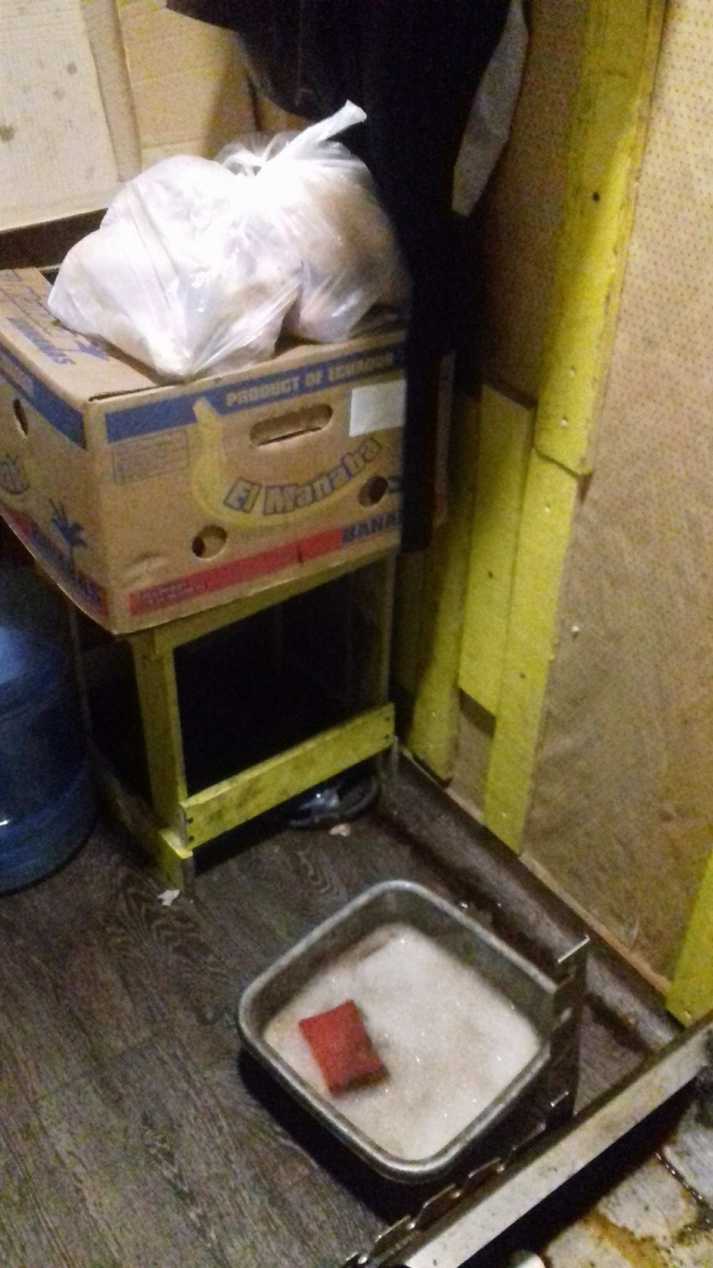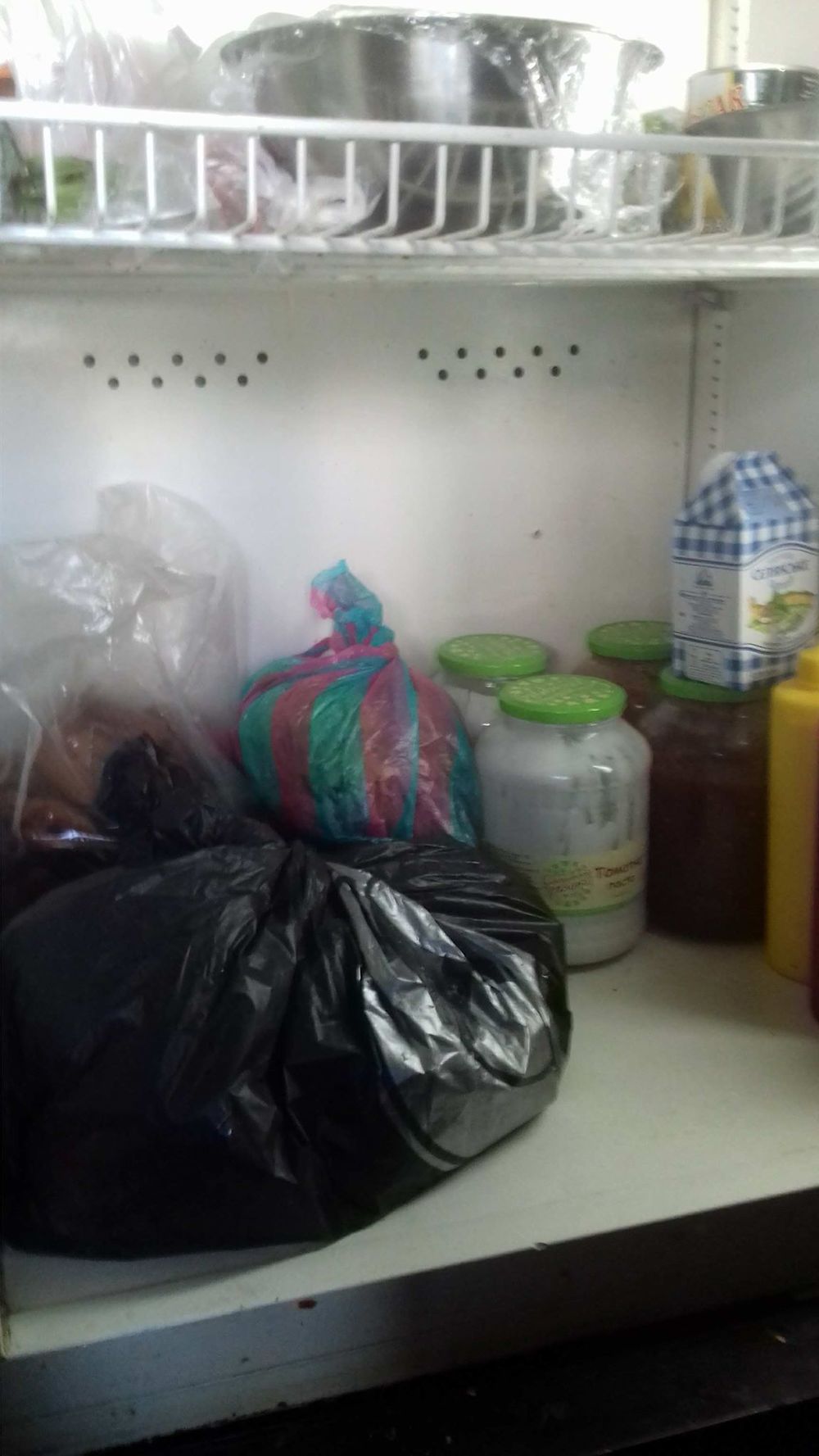 Все колбасные изделия хранятся в холодильнике, туда лишь не умещается ящик с подвядшими помидорами, пакеты с хлебом и лаваш. Этой продукции место на полочках приходится делить с моющими средствами, перчатками и стаей мух.