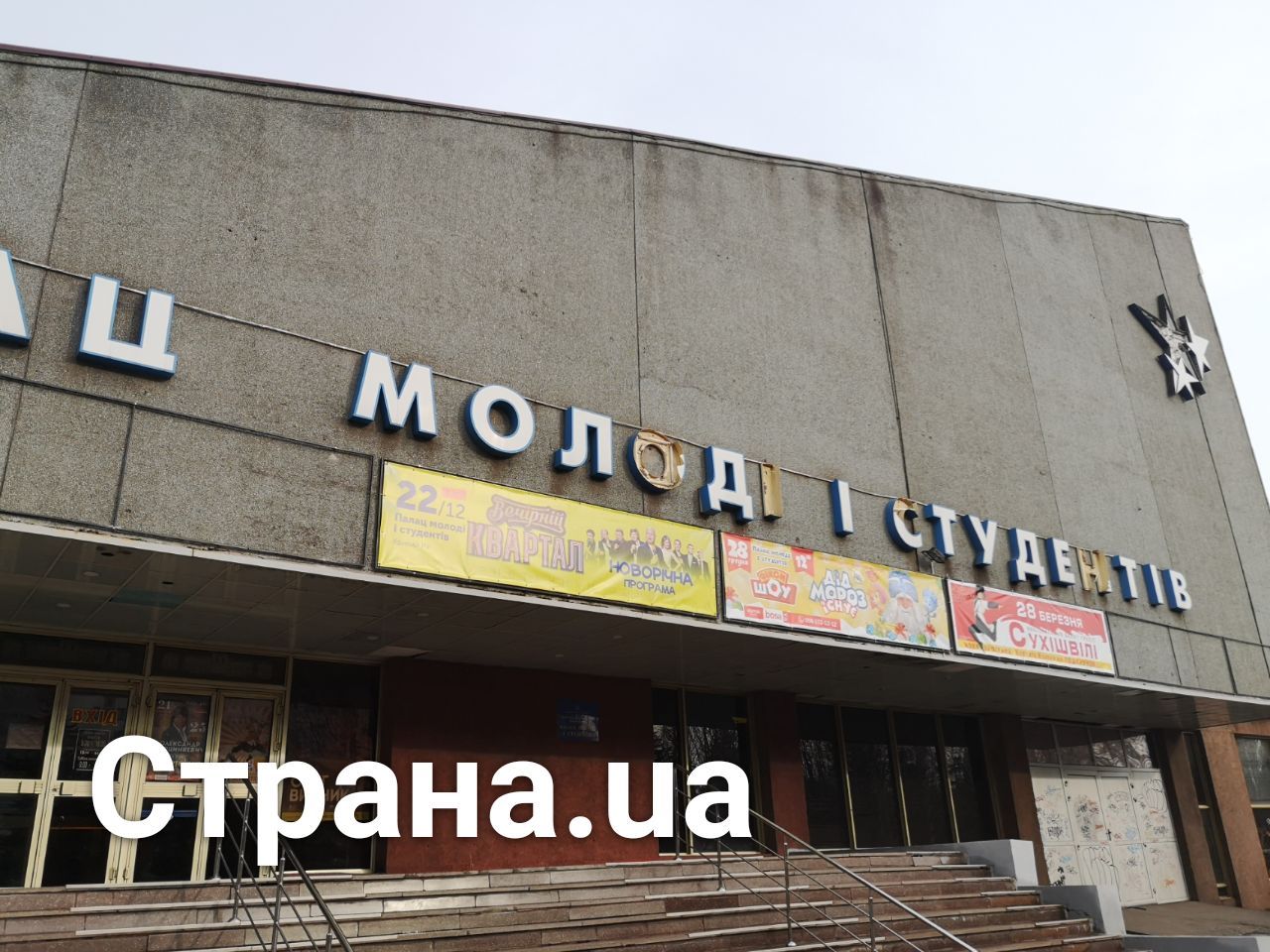 Красочные рекламы "Квартала 95" еще больше подчеркивают разруху старых криворожских построек, к которым они приклеены. Во Дворце молодежи и студентов, где состоится новогодний концерт, на фасаде, прямо над афишей "Квартала", отвалились буквы "о", "i" и "н", а "с" держится из последних сил. Видно, что здание давно не ремонтировалось.