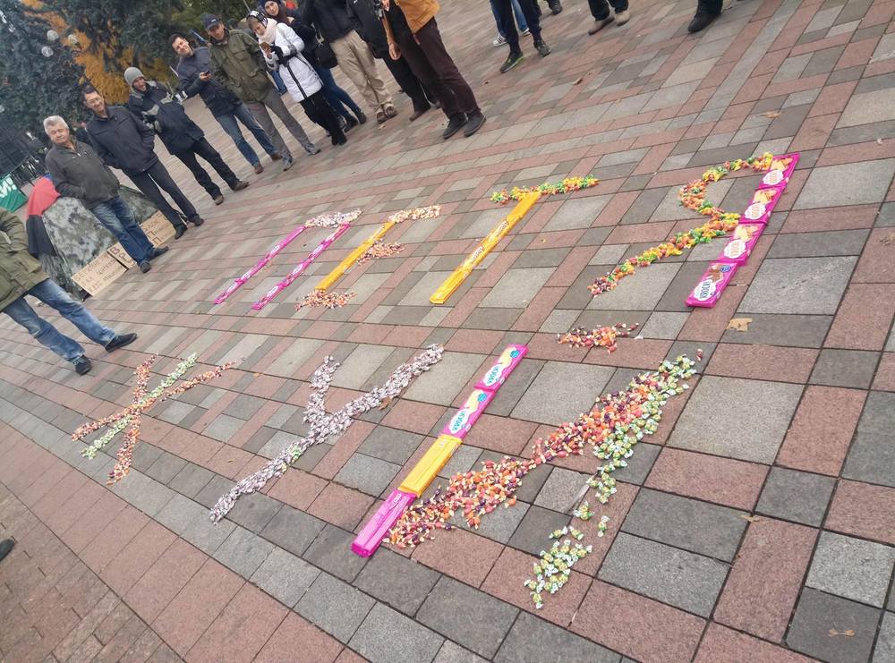 Участники МихоМайдана выложили на площади послание президенту конфетами Рошен – "Петя жуй". Фото: Анастасия Товт, Страна.ua