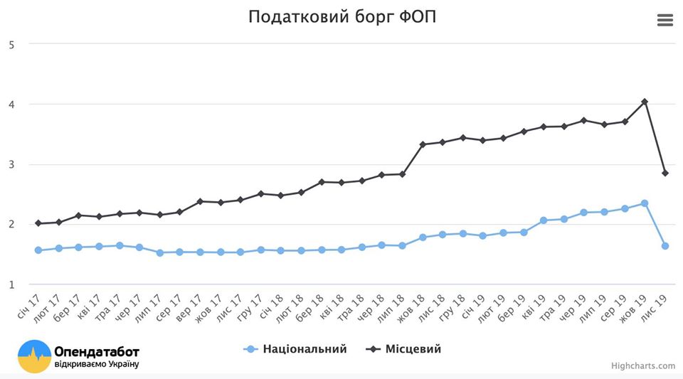 Сайт пишет, что сокращение задолженности стало неожиданным и резким, поскольку нарушило тенденцию к росту долгов ФОПов по налогам. "До ноября общий налоговый долг предпринимателей регулярно рос. За последний месяц произошел резкий скачок по уменьшению долгов как на местном, так и на национальном уровнях", - отмечают сообщают в Opendatabot.