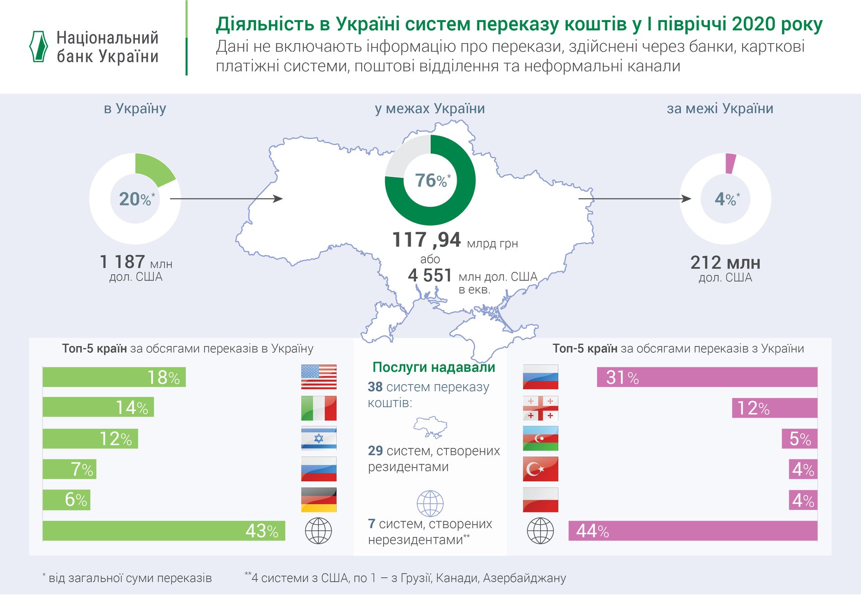 По предварительным оценкам Национального банка Украины, в январе - июне 2020 года объем частных переводов официальными и неформальными каналами каналами составил в Украину из-за границы - 5,365 миллиарда долларов США (в эквиваленте); из Украины за границу - 246 миллионов долларов США (тоже в эквиваленте).