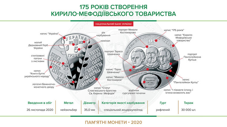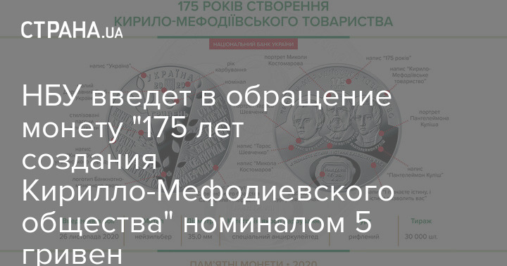 Национальный банк Украины с 26 ноября введет в обращение новую памятную монету "175 лет создания Кирилло-Мефодиевского общества" номиналом 5 гривен.