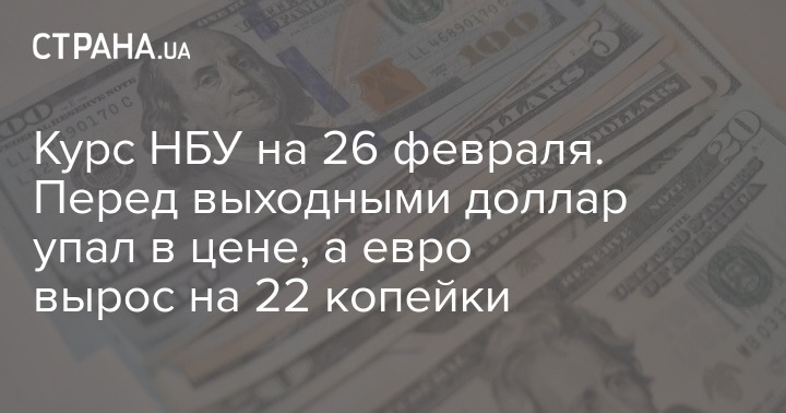 Курс НБУ на 26 февраля. Перед выходными доллар упал в цене, а евро вырос на 22 копейки