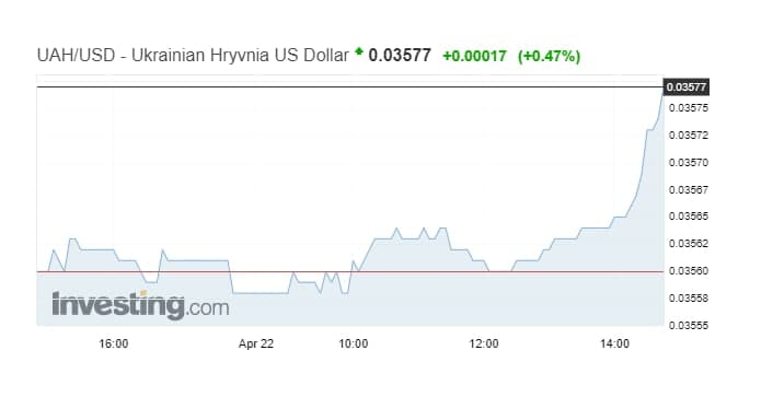 Утром, 22 апреля, торговля безналичного рынка начиналась подорожанием американской валюты на 3 копейки - в диапазоне 28,06-28,12 грн/$. Спрос на доллар был, но не сильно превышал предложение. Потому в течении часа после начала торгов, котировки отошли в область 28,055-27,075 грн/$. Однако после полудня возобновились активные валютные покупки американской валюты, казначеи говорили о спросе на доллар со стороны иностранцев. Из-за них котировки вышли на 28,08-28,11 грн/$.