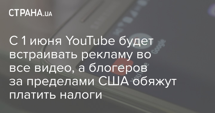 Руководство видеохостинга YouTube, принадлежащего компании Google, объявило, что с 1 июня во всех просматриваемых видео будет добавляться реклама. Также вводятся налоги для блогеров, живущих за пределами США.