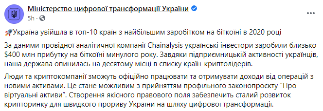 Как сообщает пресс-служба Министерства цифровой трансформации со ссылкой на данные аналитической компании Chainalysis, украинские инвесторы заработали около 400 млн долларов прибыли на биткоине в прошлом году.