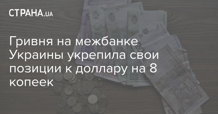 Курс гривни на межбанковском валютном рынке после снижения в среду на 10 копеек в четверг укрепился на 8 копеек и составил 27,21 гривен за 1 доллар.