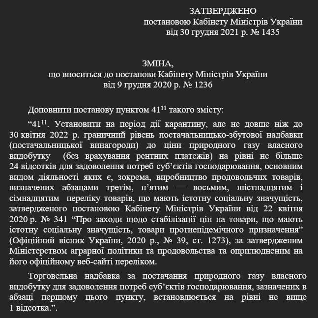 Кабинет министров ограничил предельный уровень надбавки к цене природного газа собственной добычи, который используют производители социальных продуктов. Максимальная прибавка до 30 апреля составит 24%. Об этом идет речь в постановлении правительства от 30 декабря 2021 года № 1435.