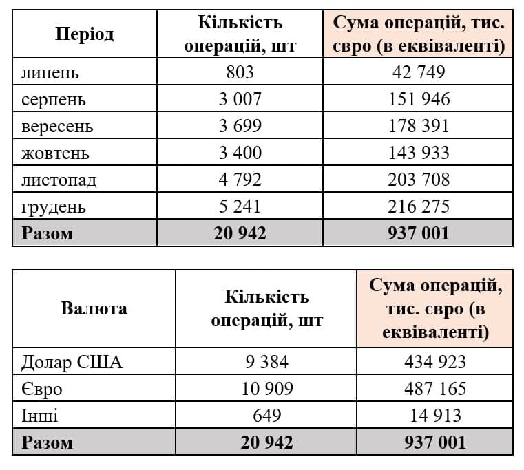 "В период с 20 июля по 31 декабря 2021 года юридические лица и физические лица – субъекты предпринимательской деятельности совершили 21 тыс. операций по покупке валюты без оснований и обязательств на сумму 937 млн евро (в эквиваленте). Среди наиболее востребованных валют в этот период были евро (52% общего объема) и доллар (45%)", — сообщили в Нацбанке.