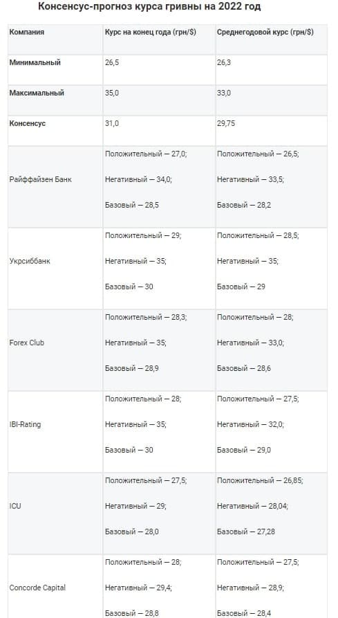 Национальный банк отказался выдавать свой курсовой прогноз. Потому из официальных оценок есть только курс Кабмина. Премьер-министр Денис Шмыгаль сообщил, что госбюджет-2022 рассчитан из среднегодового курса 28,6-28,7 грн/$.