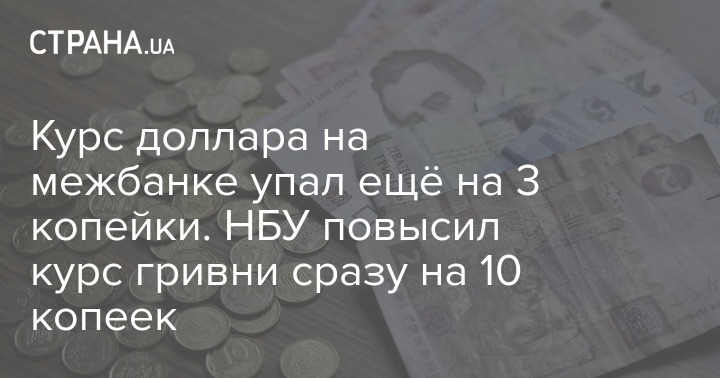 Курс гривни на межбанковском валютном рынке после укрепления в среду на 6 копеек в четверг укрепился на 3 копейки и составил 27,90 гривен за 1 доллар.