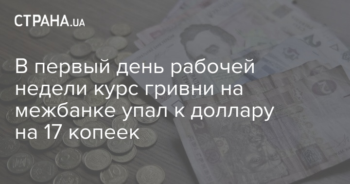 В первый день рабочей недели курс гривни на межбанке упал к доллару на 17 копеек